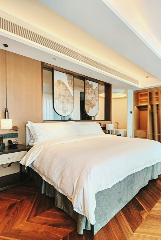 王府井紫龙花园酒店客房以55-70㎡的阔绰格局搭配全景落地窗,推窗即见胡同烟火和景山翠色。寝具选用迪拜帆船酒店同款瑞士 DUXIANA 品牌,享受深眠体验。55-75㎡ Luxury Guest Rooms · Bringing the Majesty of the Imperial City to Your Bedside